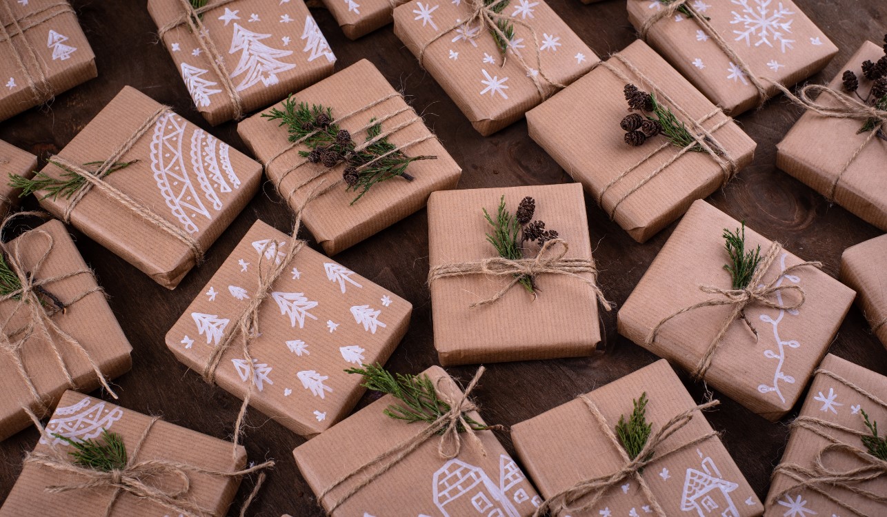Make your own cardboard gift boxes, decorated with pine cones, berries, evergreen sprigs or dried floral trinkets, or wrap presents using your children’s artwork.